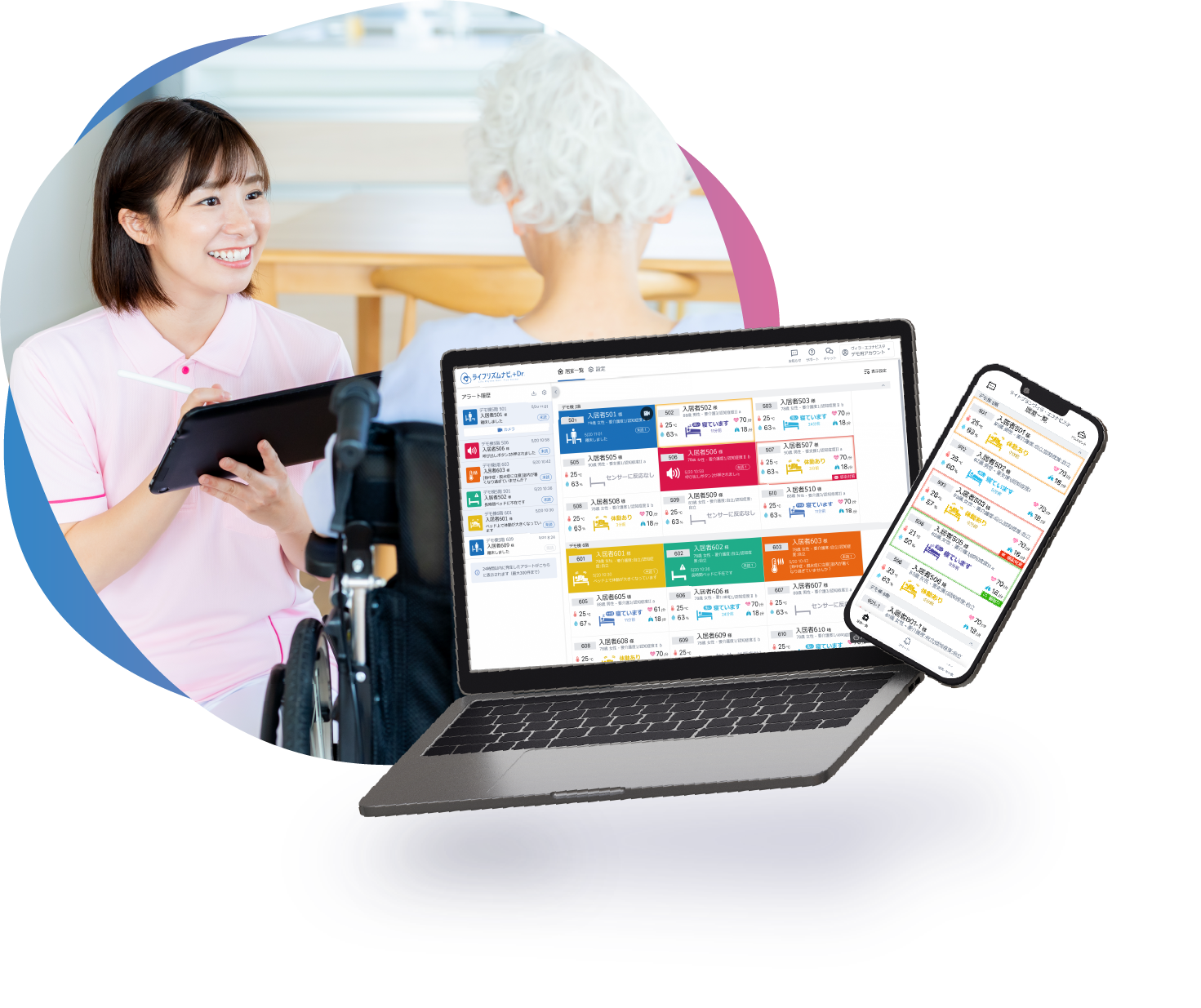 ライフリズムナビは、睡眠解析技術をベースにしたSaaS型高齢者施設見守りシステムです。居室内外に設置できるさまざまなセンサー・機器を活用して、ご入居者のプライベートを尊重しながら見守ります。 離れていてもリアルタイムに状況確認ができるため、業務効率化やお悩みの解決にお役立ていただけます。取得したデータは搭載している解析機能によりわかりやすく数値化、ケアプラン作成や専門医へ相談する際に活用いただけます。