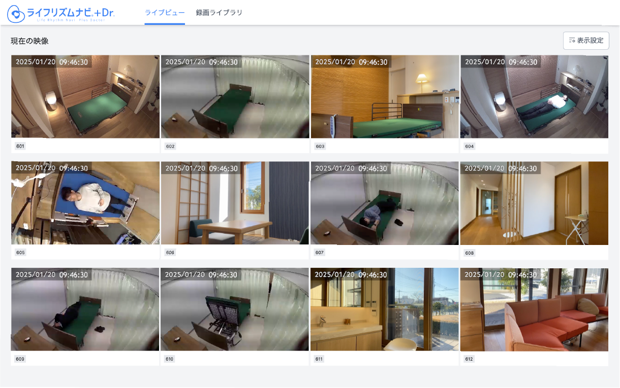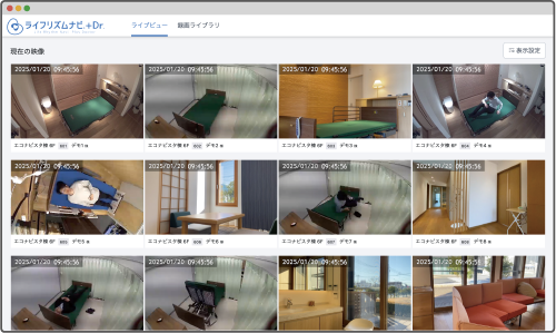 複数の居室の状況をリアルタイムに、一画面で確認できます。録画映像の閲覧やパソコンへのダウンロード操作も簡単です。